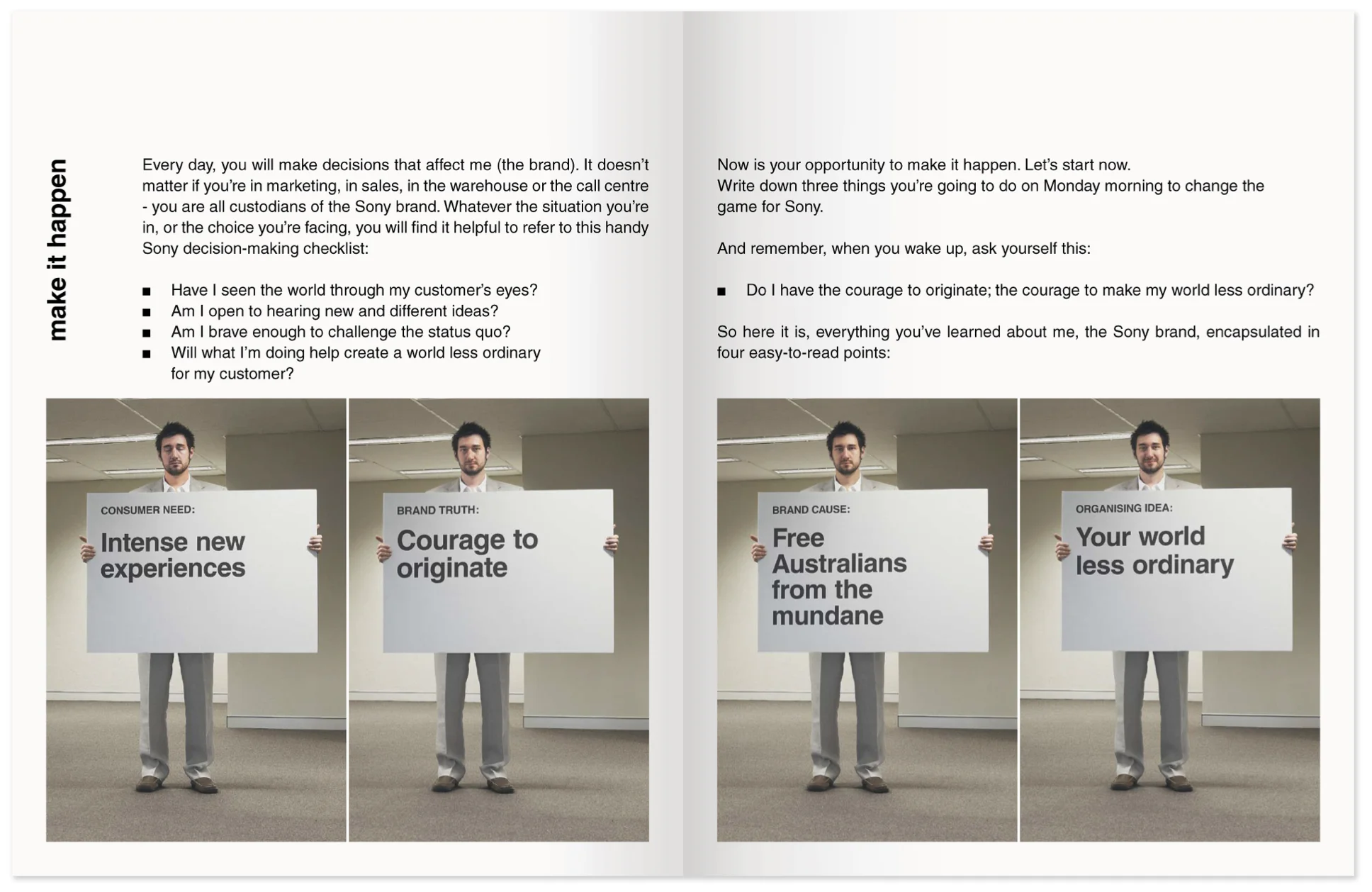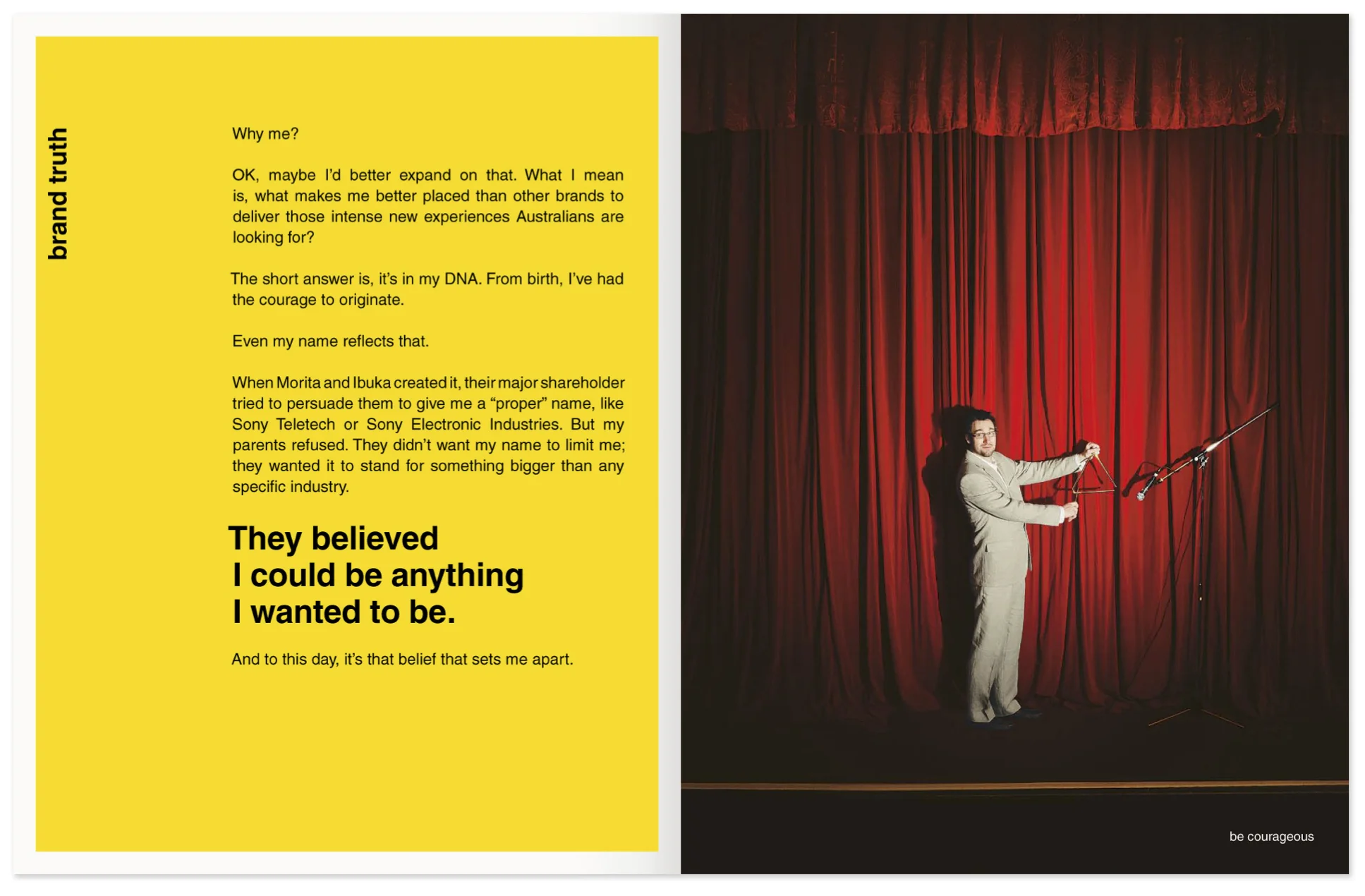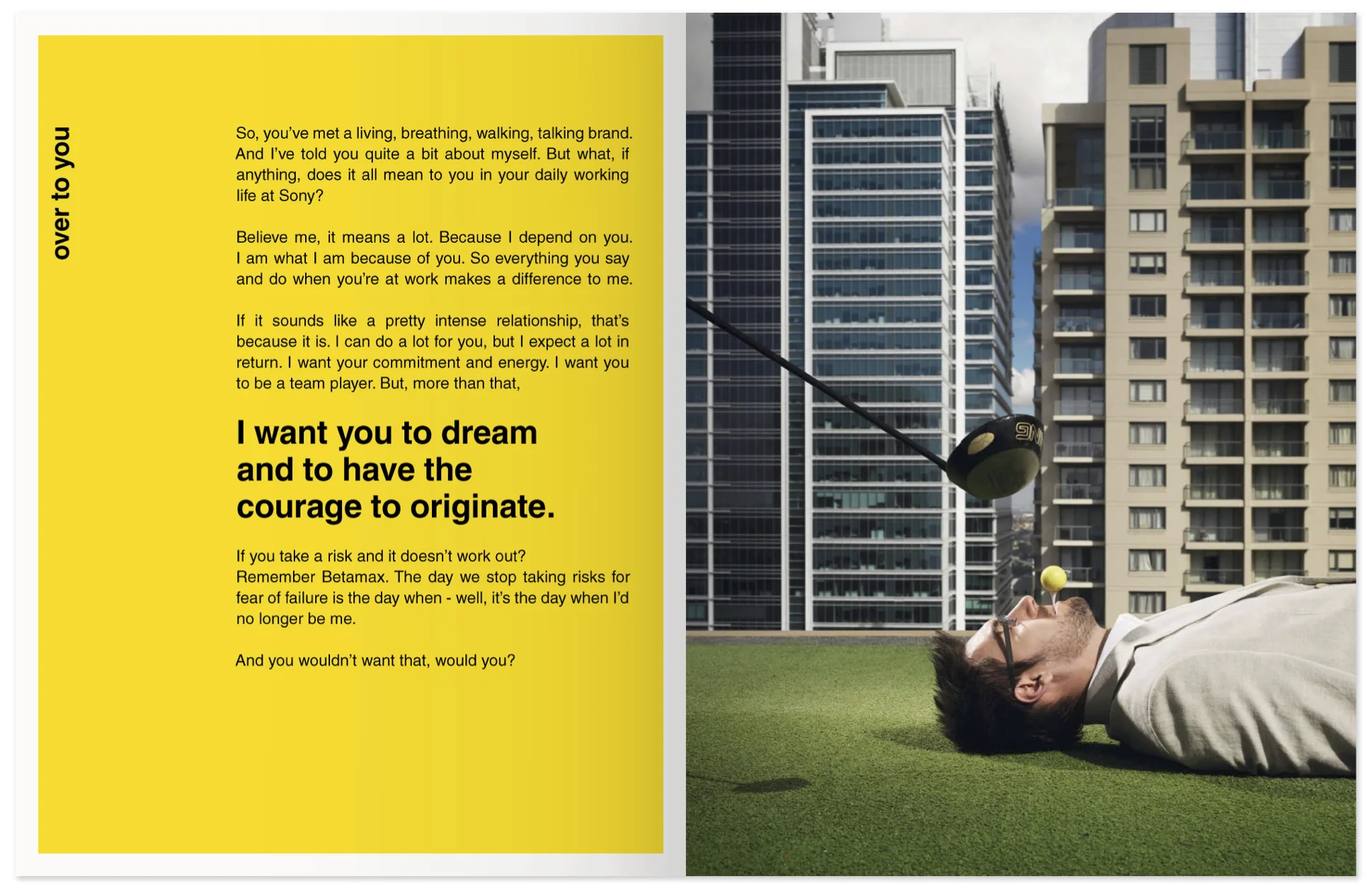 Sony staff needed to be educated about the history and future goals of the brand. Brands are ethereal concepts and can be difficult to describe in an engaging way. Most corporation mission statements are boring and meaningless. So our idea, personify the brand. An actor was cast as Sony to tell the story of his life - his history, his DNA, his hopes and fears about the future.
