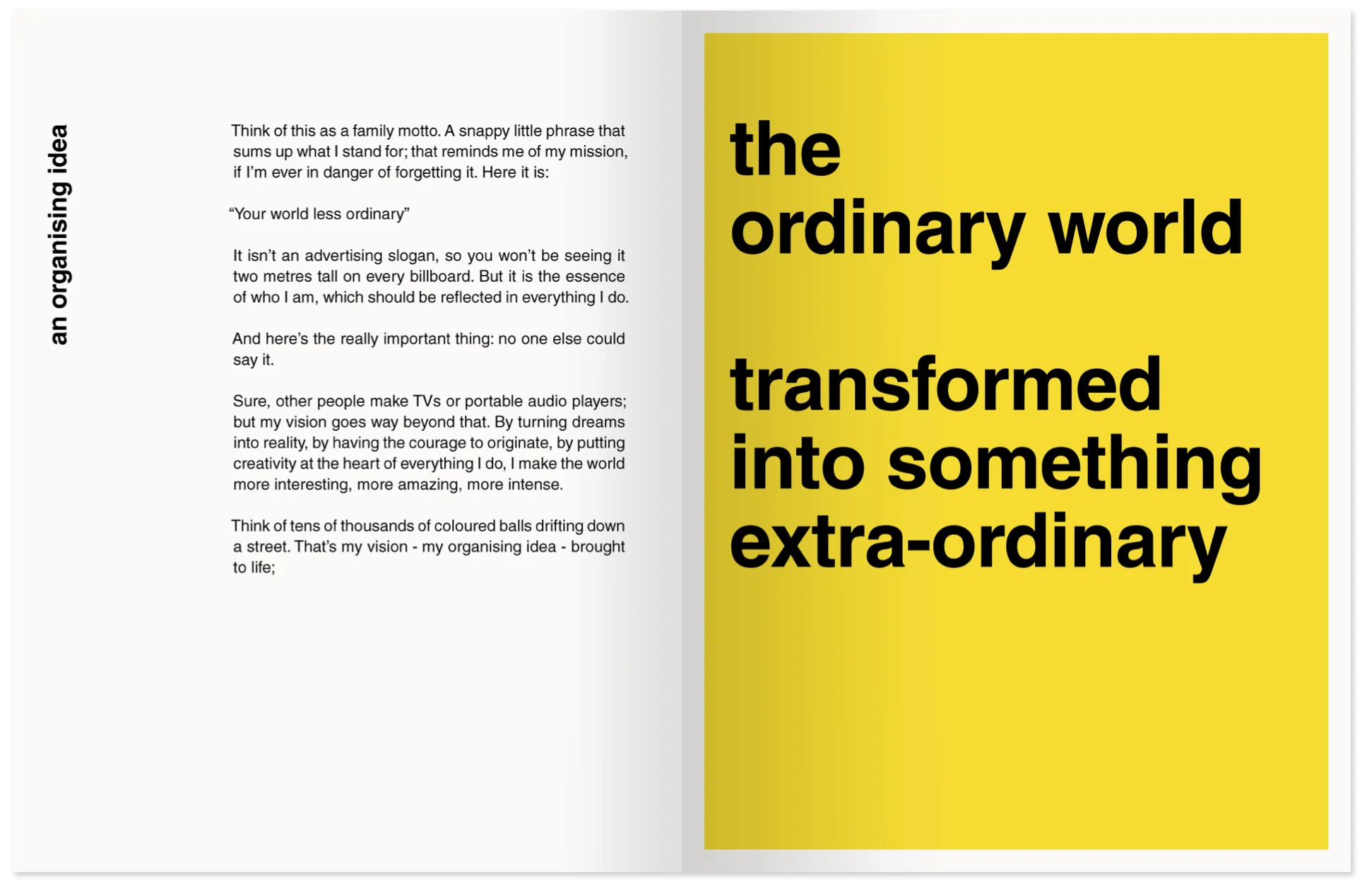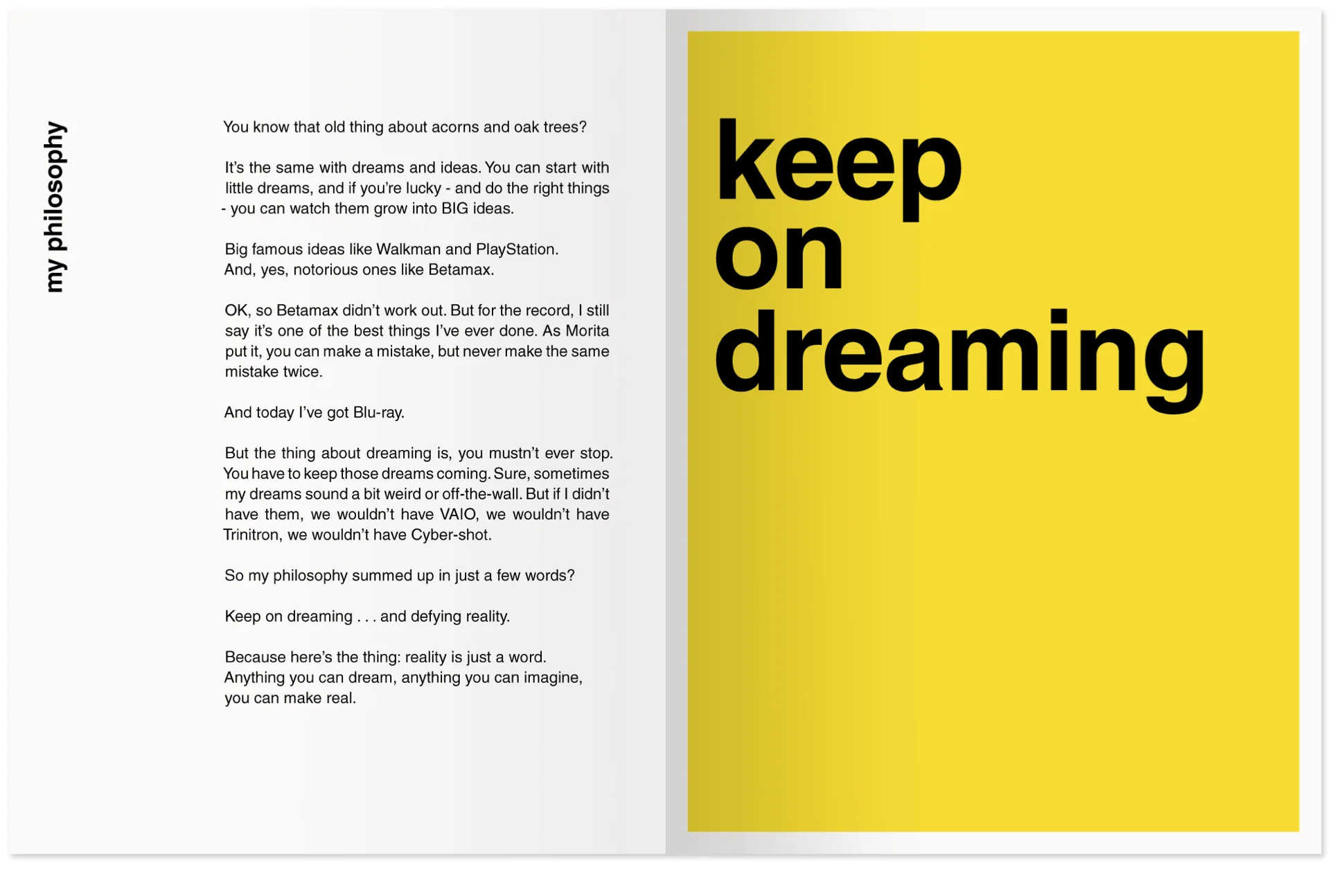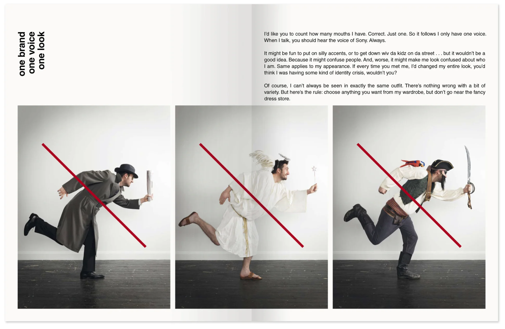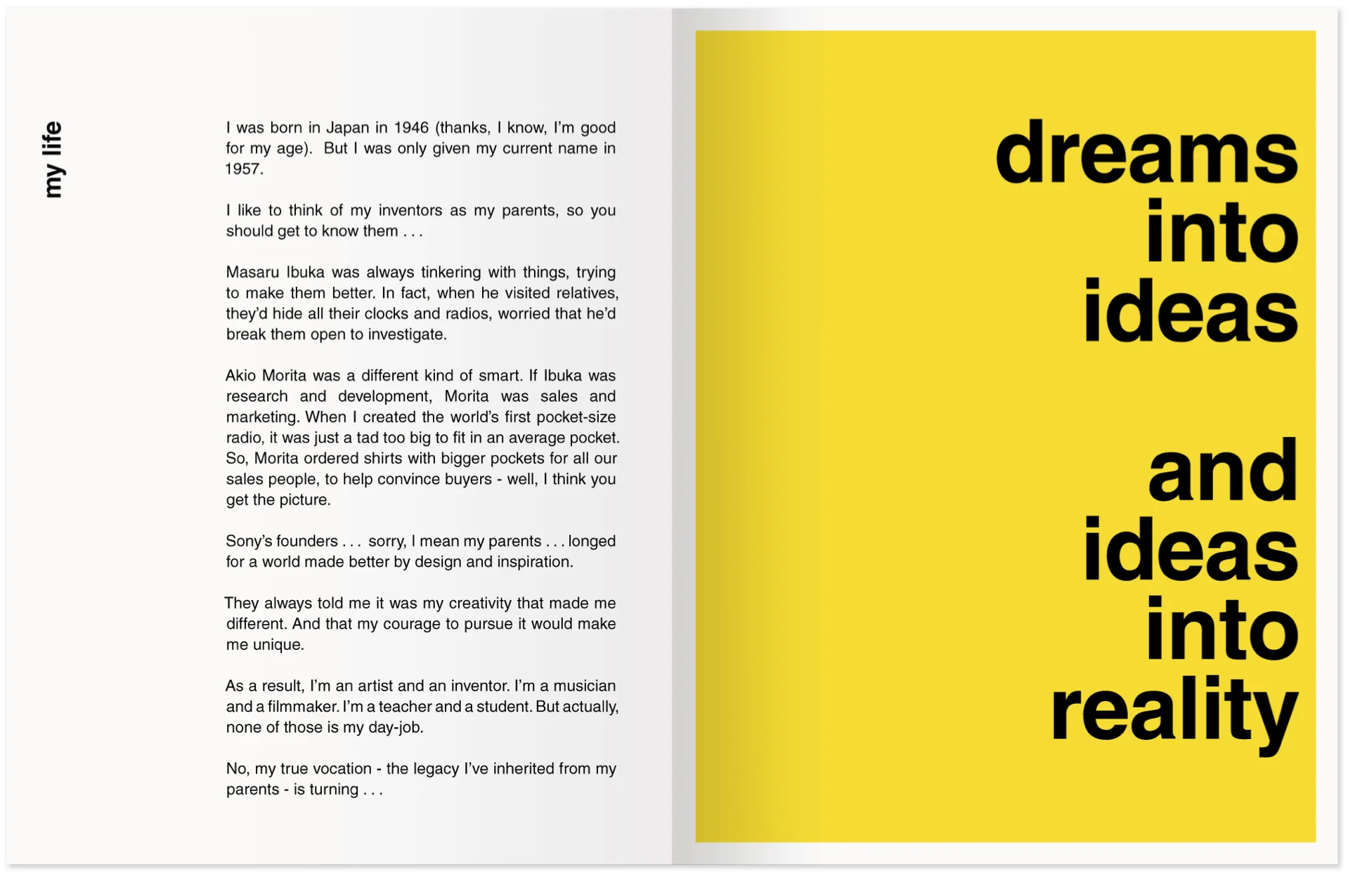 Sony staff needed to be educated about the history and future goals of the brand. Brands are ethereal concepts and can be difficult to describe in an engaging way. Most corporation mission statements are boring and meaningless. So our idea, personify the brand. An actor was cast as Sony to tell the story of his life - his history, his DNA, his hopes and fears about the future.